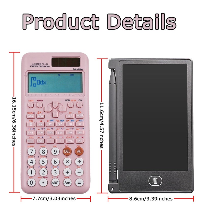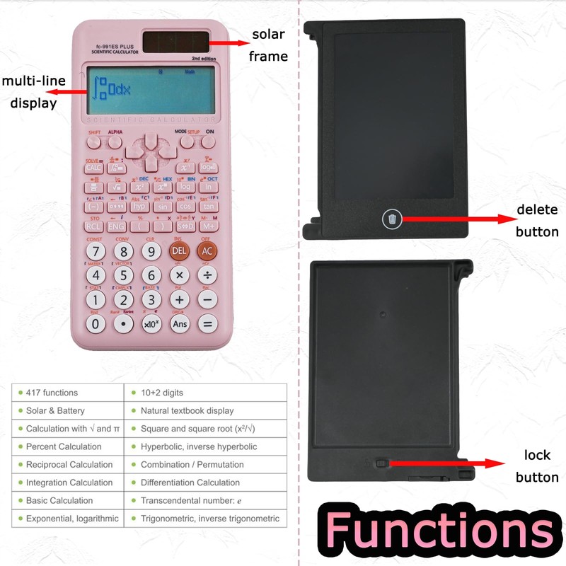 - Package Includes: 1X pink scientific calculator (batteries included) with 4.4 inch writing pad, 2 X instructions.