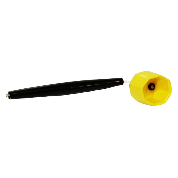 Octagon style chalk holder with stick. Black plastic stick, white string, silver colored eight ball attached to a plastic octagon chalk holder.
