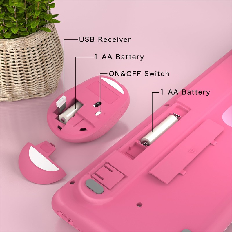 FCPLU xUBOTIE Wireless Keyboard and Mouse Combo, 104-Key Colorful Round Keycap, QWERTY Layout, 2.4GHz, Power Button, Plug Play for PC Laptop (Rosy-Red)