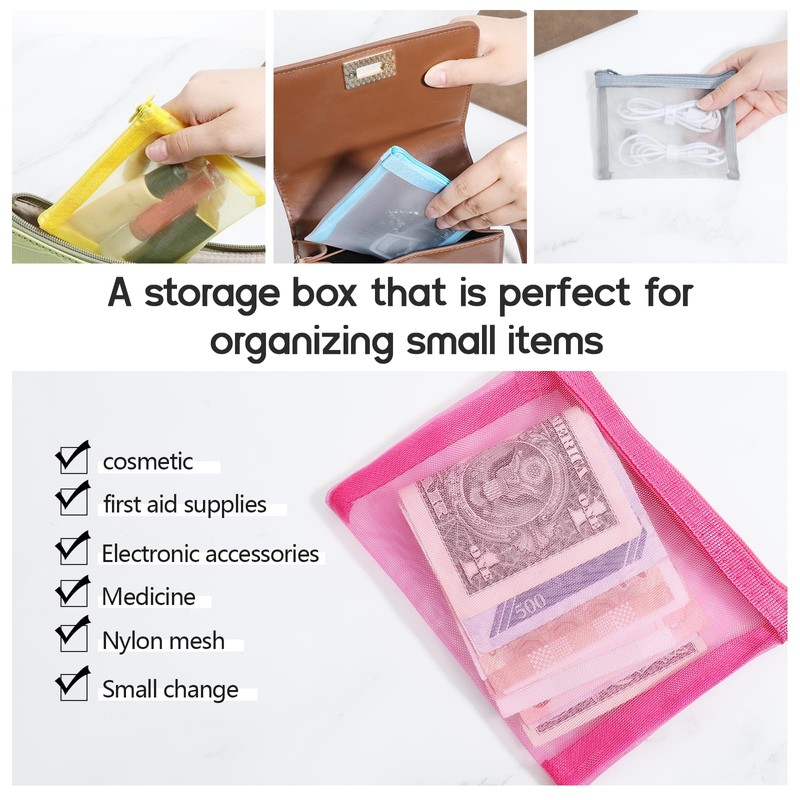 - Wide Application: This mesh zipper bag is versatile and can store cosmetics, electronic accessories, keys, bank cards, invoices, travel necessities, etc. It is very suitable for reuse at home and on-the-go office travel
