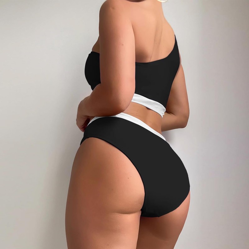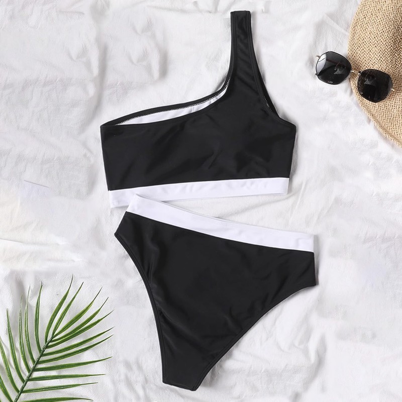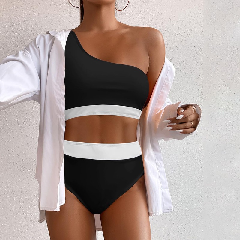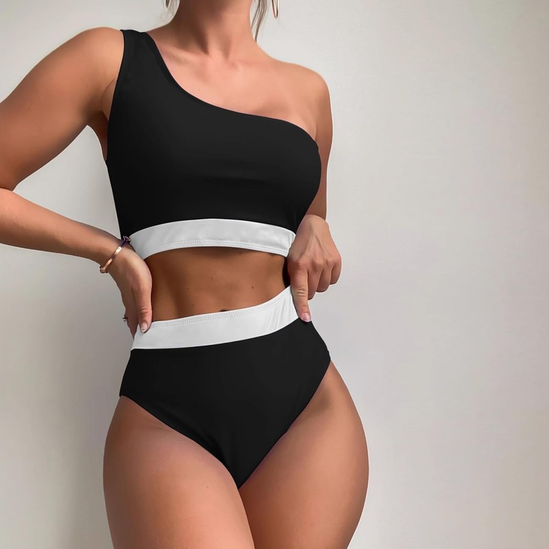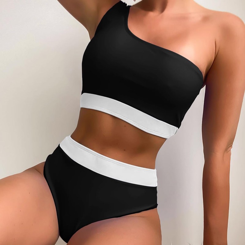 - ✿Features: One shoulder bikini top: The one-shoulder bandeau strap design is very special and can make you stand out in the crowd. The colour block brings a sense of visual impact and also highlights the layers of your body. SEXY HIGH WAISTED BIKINI BOTTOM The contrast high waist bikini bottom with tummy control provides full coverage to make you feel more comfortable.