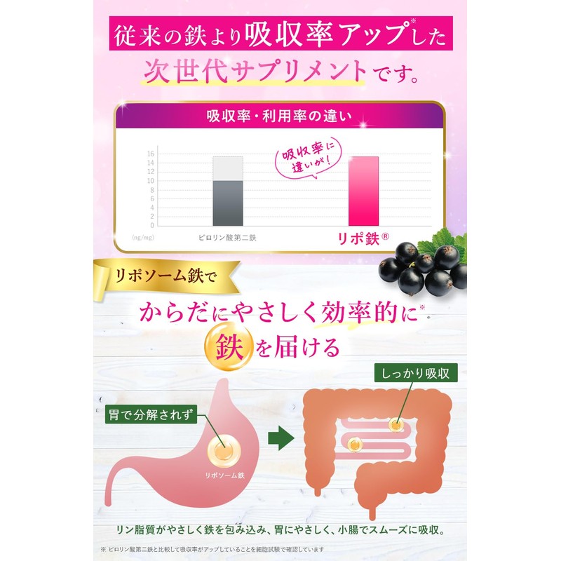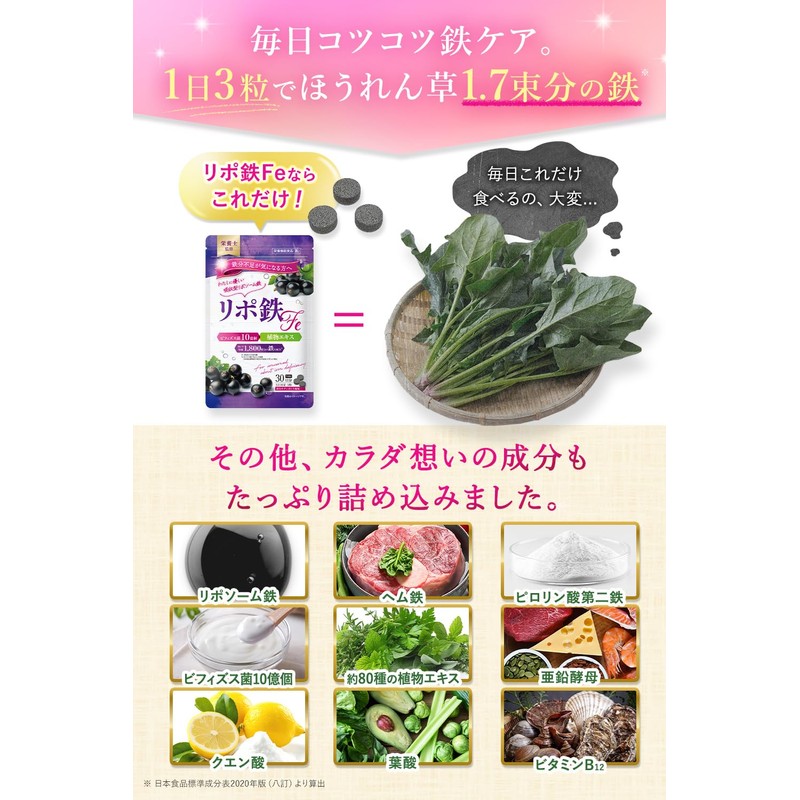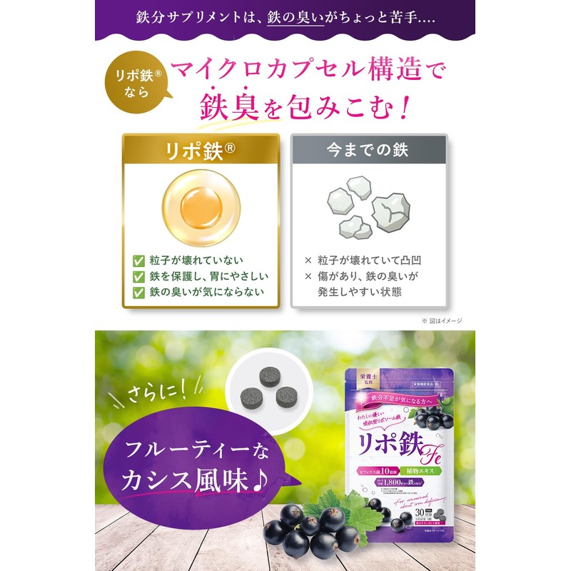 - リポ鉄Feは、鉄不足でお悩みの皆さんが美味しく毎日とれるように、占部大観堂製薬(株)にて栄養士が監修し、開発製造したサプリメントです。 リポ鉄Feなら、ほうれん草1束と2/3束分の鉄分がとれます!毎日ほうれん草1束たべるのは難しいですが、リポ鉄Feなら、3粒目安をサッと飲むだけ! ◆吸収型リポソーム鉄と、ヘム鉄、ピロリン酸第二鉄。なんと3つの鉄を配合。とくにリポソーム鉄は、吸収率のよい鉄で、かつ、体に優しいものです。(※ピロリン酸第二鉄と比較して吸収率がアップしていることを細胞試験で確認しています) ◆香りよいカシス風味でとても飲みやすいです!お水でサッと飲んでも、噛んで食べてもOK