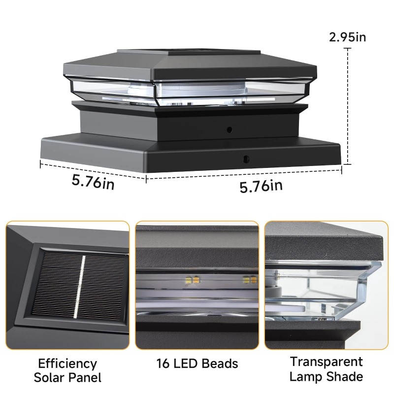 - Garden/Patio/Decoration The 4x4 post solar lights single Dimension: 5.8 x 5.8 x 3.54 inches, mount on fences, deck railings, or boundary pillars throughout your front garden, enhancing pathways, drive approaches, patio, and garden borders. Solar post cap lights project radiance to accentuate flowerbeds, highlight architectural features. decorate your fence, deck, patio, porch, and landscaped gardens while complementing outdoor living spaces