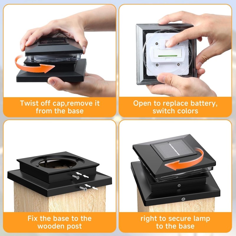 - Easy installation4x4 post solar lights come with installation instructions on the outside and inside of the packaging fence post solar lights are designed with multiple base options, making them compatible with standard, 4x4, 6x6 wood, 4x4, 5x5 vinyl, or plastic posts for easy installation(The wood mount is 0.5 inches smaller than the listed size). Mount the solar light on the fence post using the included mounting screws.