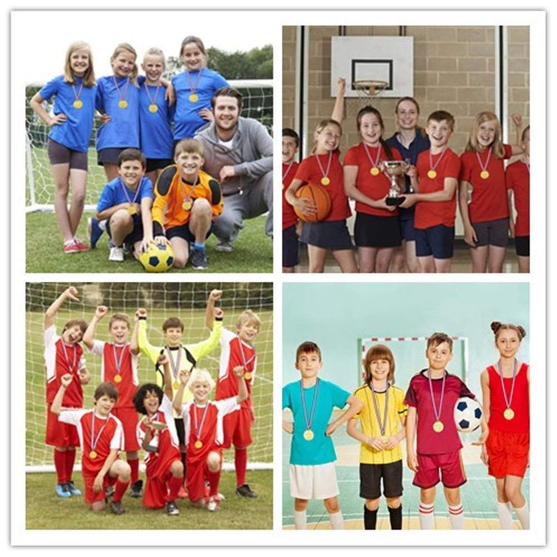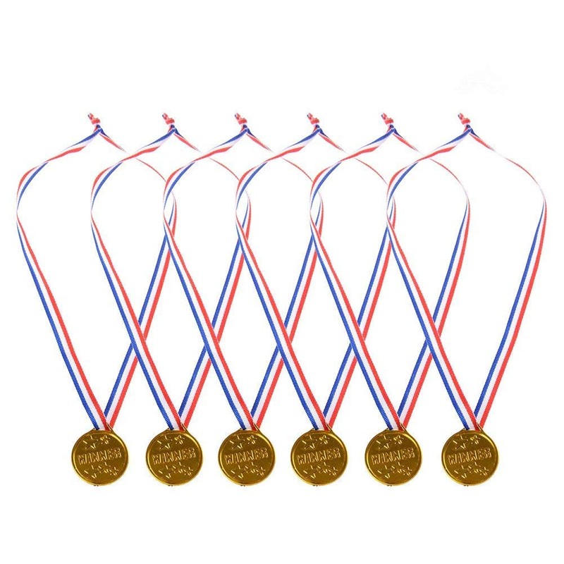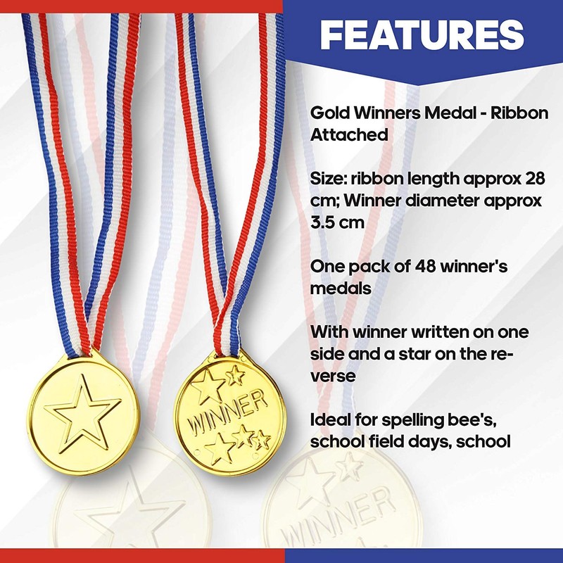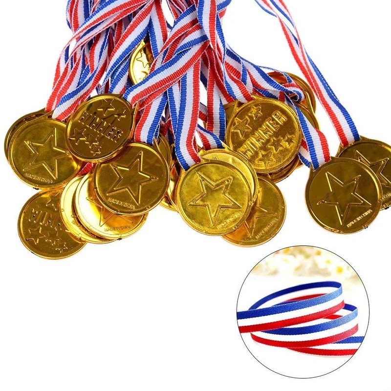 - Two-side winner gold medals: made of plastic and ribbon, each plastic gold winner medal has two different sides