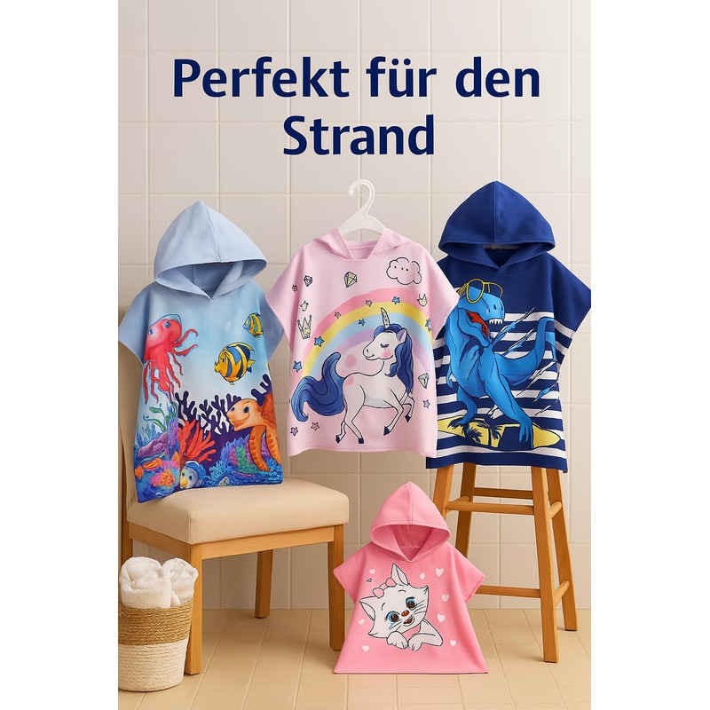 • Colorful Patterns and Graphics The colorful patterns and graphics on the bath ponchos stimulate children's imagination and bring joy to their day. Whether cute animal motifs, adventurous jungle scenes or cheerful rainbows - there is the right design for every taste.