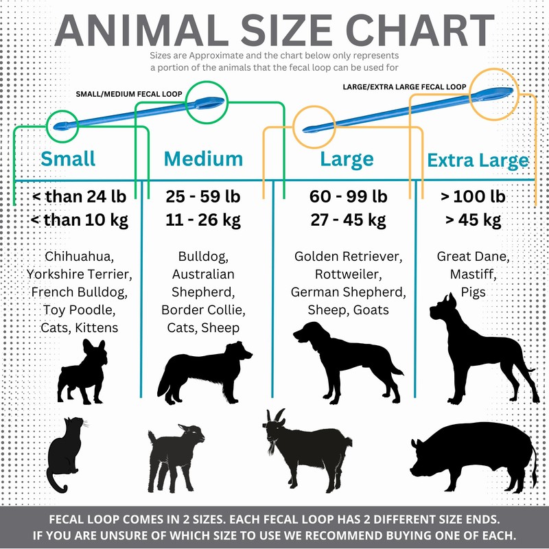 - LARGE/EXTRA LARGE FECAL LOOP FOR ANIMALS. EACH END IS A DIFFERENT SIZE. 1 SMALLER 5/16” (8 mm) AND 1 BIGGER 3/8” (9.5 mm) including, larger dogs, goats, sheep, and large creatures in this size range