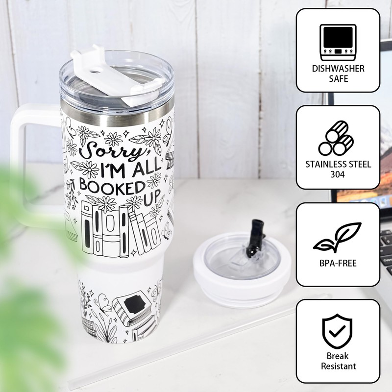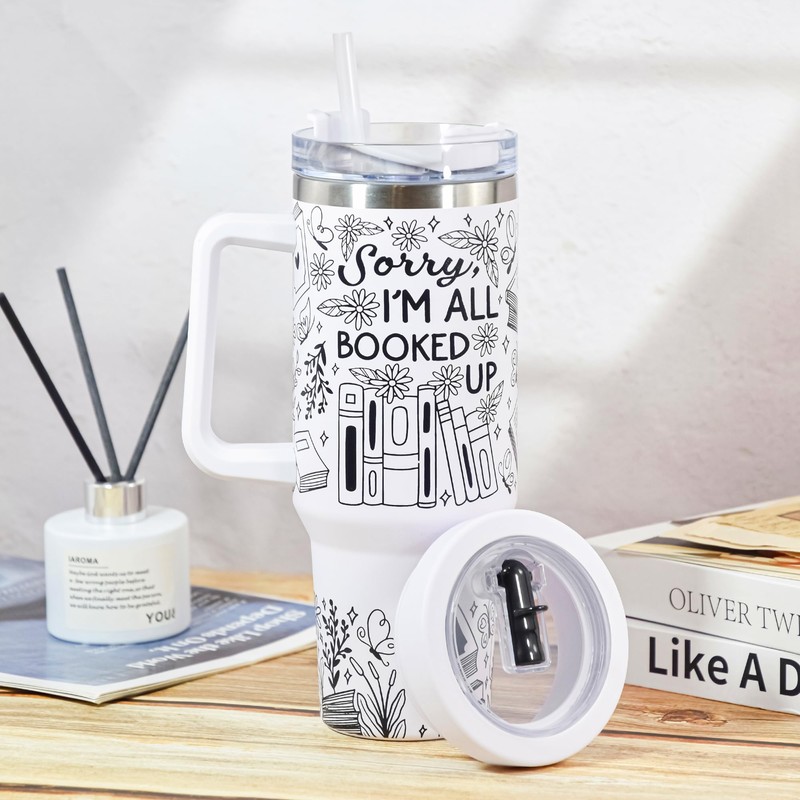 - GREAT GIFTS FOR BOOK LOVERS: Bookworms, “Sorry, I'm All Booked Up”. This 40 oz tumbler with beautiful book and flower designs, it's tailored for reading enthusiasts. Perfect for Book Club meets or other book - themed events. If you know someone who adores reading, it's a wonderful way to show you appreciate their passion.