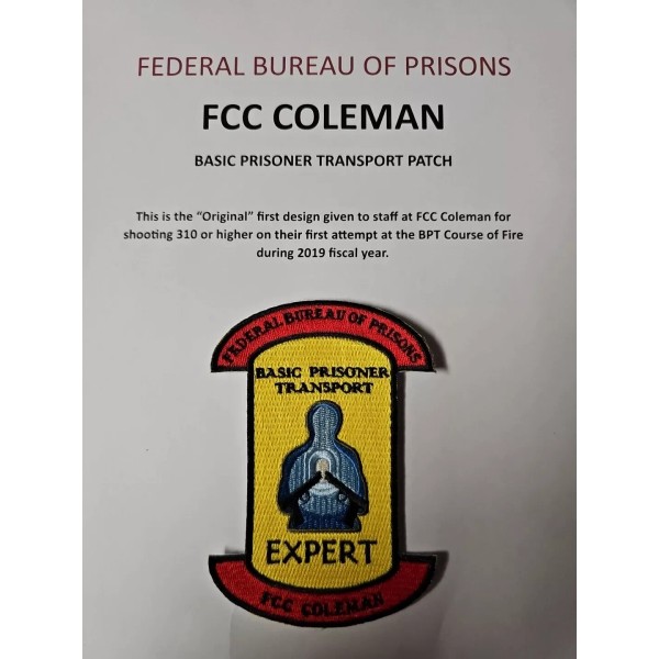 This is the original patch given to staff at FCC Coleman during 2019 fiscal year. Staff were required to shoot a 310 or higher on their first attempt at the BPT course of fire to earn.
