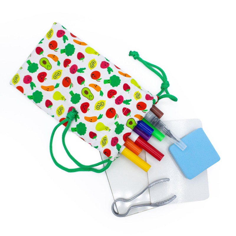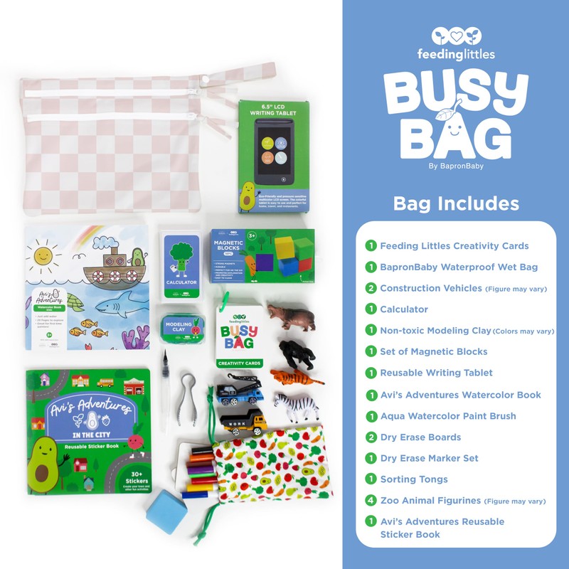 - CONTAINS - Feeding Littles Busy Bag by BapronBaby includes 18 Magnetic Blocks, Reusable LCD Writing Tablet, Avi's Adventures Watercolor Paint Book + Water Pen, Calculator and Case, 4 Zoo Animal Figurines & 2 Construction Vehicles (figures may vary), Avi's Adventures Reusable Sticker Book, Non-toxic Modeling Clay (colors may vary), 2 Mini Dry-erase Boards with Eraser, 8 Dry-erase Markers in a Fabric Bag, Easy-grip Tongs and Waterproof BapronBaby Wet Bag.