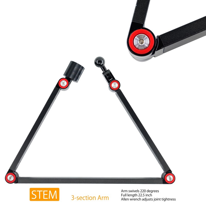 • 𝟯-𝗦𝗲𝗰𝘁𝗶𝗼𝗻 𝗔𝗿𝗺: The FL15C features a three-section arm that extends up to 22.5 inches. Each section's joint can be adjusted with an Allen wrench and rotates approximately 220 degrees. This means the FL15C is incredibly flexible in positioning, but finding the perfect spot can be time-consuming. The joints are detachable and reconfigurable, allowing you to add or remove sections as needed. It's an excellent portable monitor stand or iPad stand floor model.