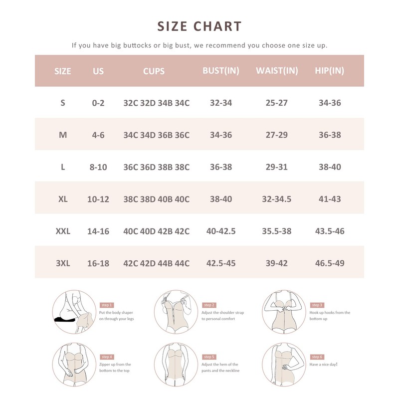 - SIZE TIP: Please refer to the size chart to choose the most suitable size for you according to your body parameters. If this is your first time to wear this kind of shapewear, we suggest you buy one size bigger for all-day comfort.