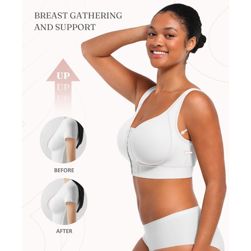 - EASY ADJUSTMENTS: Our shaping compression bra offers versatile adjustments to accommodate various cup sizes effortlessly. The front closure bra features three rows of adjustable hooks, allowing you to find the most suitable fit during your recovery. The wide shoulder straps gently distribute pressure to reduce shoulder strain, and the adjustable straps allow you to customize the fit, ensuring a more personalized and comfortable experience for your bust.