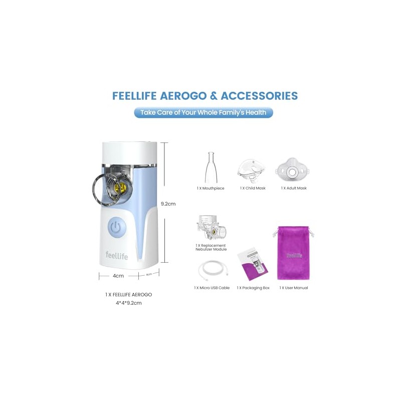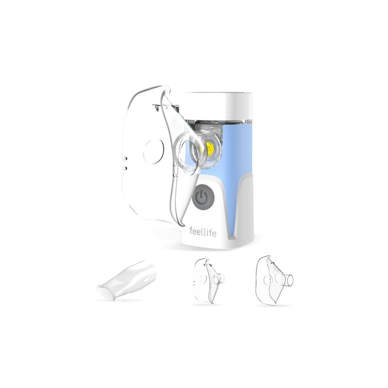 - Easy Clean and Use Supplied with mouthpiece, children's face mask and adult mask, velvet pouch, etc. The Feellife nebuliser machine for adults and children. Built-in removable solution cup for easy cleaning and use. No need to worry about clogging.