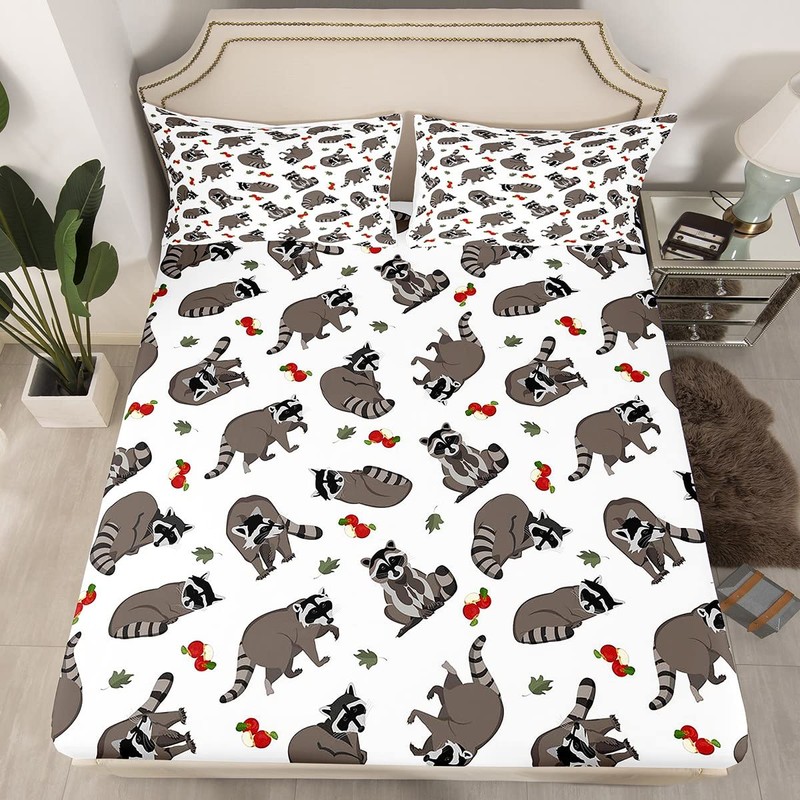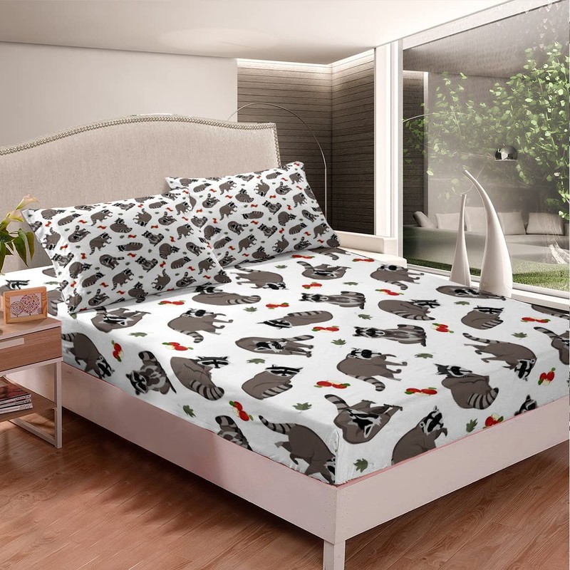 Feelyou Cute Raccoons Bed Set Cartoon Raccoon Bed Sheets for Kids Boys Girls Lovely Fruits Leaves Decor Sheet Set Grey Animal Sheets with 2 Pillowcases 4Pcs Bedding Queen