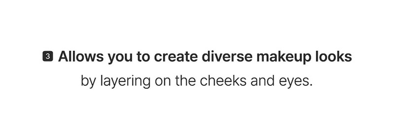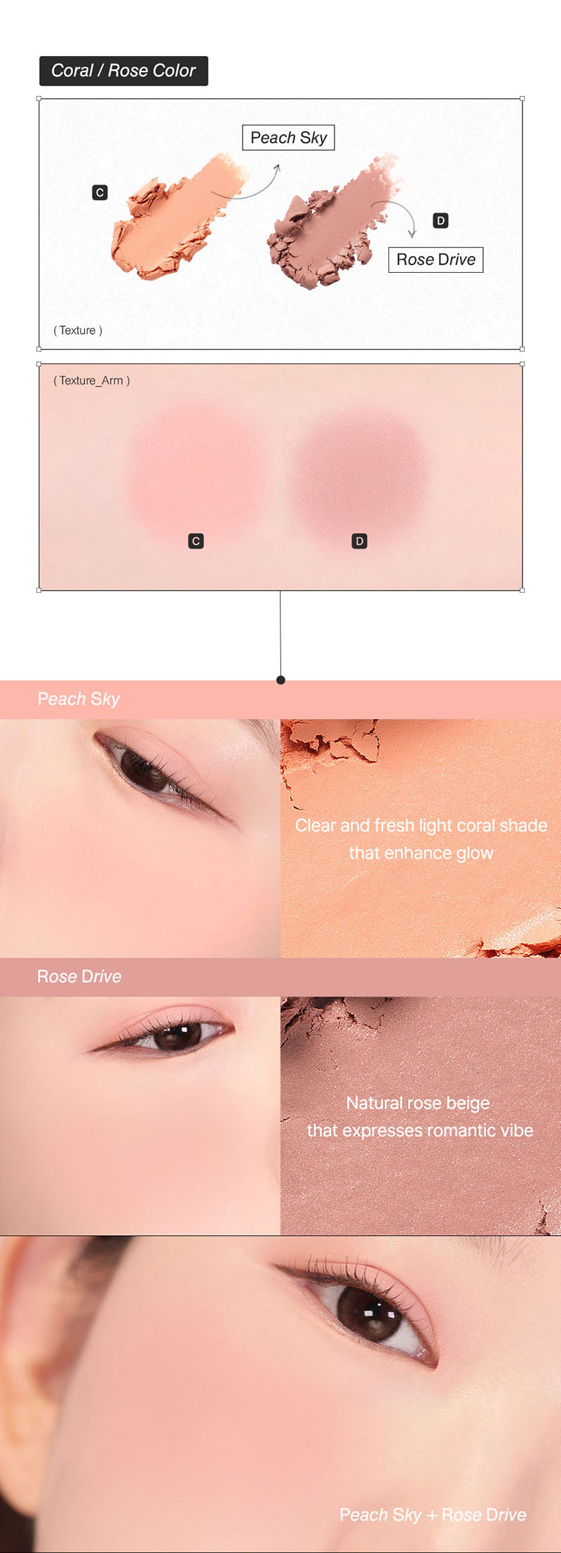 #Multi-use Use a finger or tool and lightly touch on areas you want including cheek and eyes to do easy tone-on-tone makeup. *When using a brush, lightly tap to apply the product. #Color layering Gently rub desired shade with fingertip and tap on both cheeks. Layer two different shades to make your own color mood. *Instead of applying ample amount at a time, layer the shade little by little.