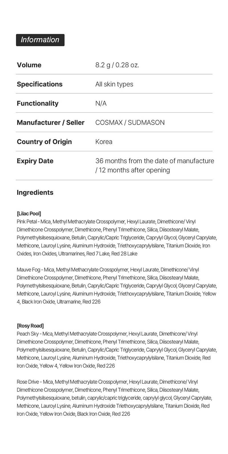 - Ingredients: [LILAC POOL – Pink Petal] Mica, Methyl Methacrylate Crosspolymer, Hexyl Laurate, Dimethicone/Vinyl Dimethicone Crosspolymer, Dimethicone, Phenyl Trimethicone, Silica, Diisostearyl Malate, Polymethylsilsesquioxane, Betulin, Caprylic/Capric Triglyceride, Caprylyl Glycol, Glyceryl Caprylate, Methicone, Lauroyl Lysine, Aluminum Hydroxide, Triethoxycaprylylsilane, Titanium Dioxide, Iron Oxide Red, Iron Oxide Yellow, Ultramarines, Lithol Rubine BCA, Helindone Pink CN [LILAC POOL – Mauve Fog] Mica, Methyl Methacrylate Crosspolymer, Hexyl Laurate, Dimethicone/Vinyl Dimethicone Crosspolymer, Dimethicone, Phenyl Trimethicone, Silica, Diisostearyl Malate, Polymethylsilsesquioxane, Betulin, Caprylic/Capric Triglyceride, Caprylyl Glycol, Glyceryl Caprylate, Methicone, Lauroyl Lysine, Aluminum Hydroxide, Triethoxycaprylylsilane, Titanium Dioxide, Tartrazine, Iron Oxide Black, Ultramarines, Helindone Pink CN [ROSY ROAD – Peach Sky] Mica, Methyl Methacrylate Crosspolymer, Hexyl Laurate, Dimethicone/Vinyl Dimethicone Crosspolymer, Dimethicone, Phenyl Trimethicone, Silica, Diisostearyl Malate, Polymethylsilsesquioxane, Betulin, Caprylic/Capric Triglyceride, Caprylyl Glycol, Glyceryl Caprylate, Methicone, Lauroyl Lysine, Aluminum Hydroxide, Triethoxycaprylylsilane, Titanium Dioxide, Iron Oxide Red, Tartrazine, Iron Oxide Yellow, Helindone Pink CN [ROSY ROAD – Rose Drive] Mica, Methyl Methacrylate Crosspolymer, Hexyl Laurate, Dimethicone/Vinyl Dimethicone Crosspolymer, Dimethicone, Phenyl Trimethicone, Silica, Diisostearyl Malate, Polymethylsilsesquioxane, Betulin, Caprylic/Capric Triglyceride, Caprylyl Glycol, Glyceryl Caprylate, Methicone, Lauroyl Lysine, Aluminum Hydroxide, Triethoxycaprylylsilane, Titanium Dioxide, Iron Oxide Red, Iron Oxide Yellow, Iron Oxide Black, Helindone Pink CN