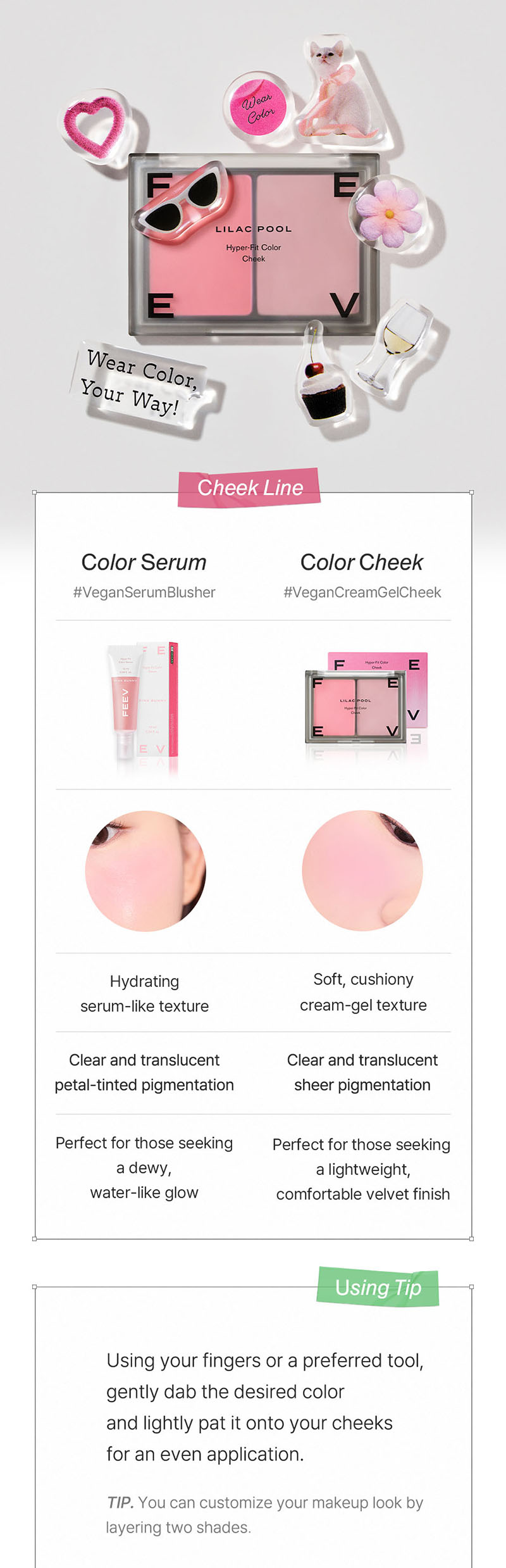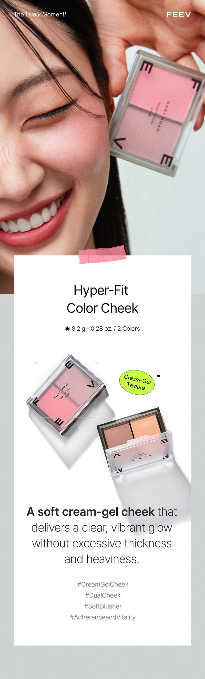 The hyper-fit color cheek which is the second product of FEEV health wear line is a multi-cheek palette that consists of two different tone-on-tone shades in hybrid cream-gel texture. The hybrid cream-gel texture is complete with advantages of cream and gel formula to provide vivid pigmentation without removing base makeup. Provides lively and soft mood without resulting in stuffiness even when applied for multiple times. This product is certified by French EVE Vegan. Consists of 2 different shades that provide various vitalizing moods without any stuffiness even when applied for multiple times. Completed low irritation test for sensitive skin types.