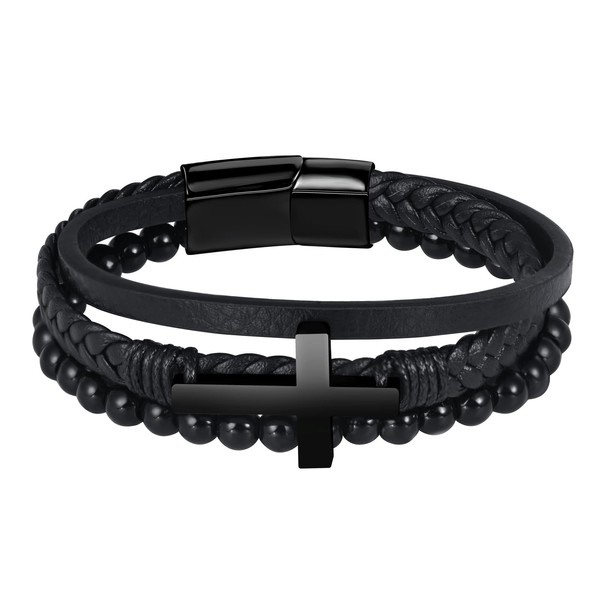 Feilok Cross Pearl Bracelet Men's Leather Bracelet Natural Stone Braided Bracelet Bangle Wrap Bracelet Cuff with Magnetic Closure, Leather