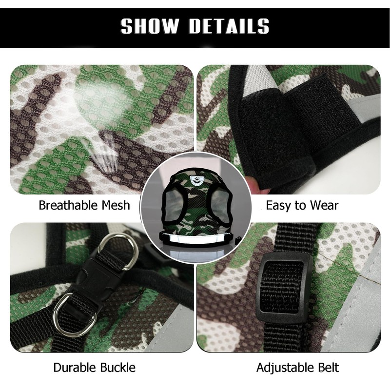 • Reflective and safe - The reflective design of the dog harness strap makes it visible in dark night and low light conditions and improves safety when dogs and cats run at night. The vest-like design evenly distributes the stress area of the chest and shoulders and reduces the stress of the dog.