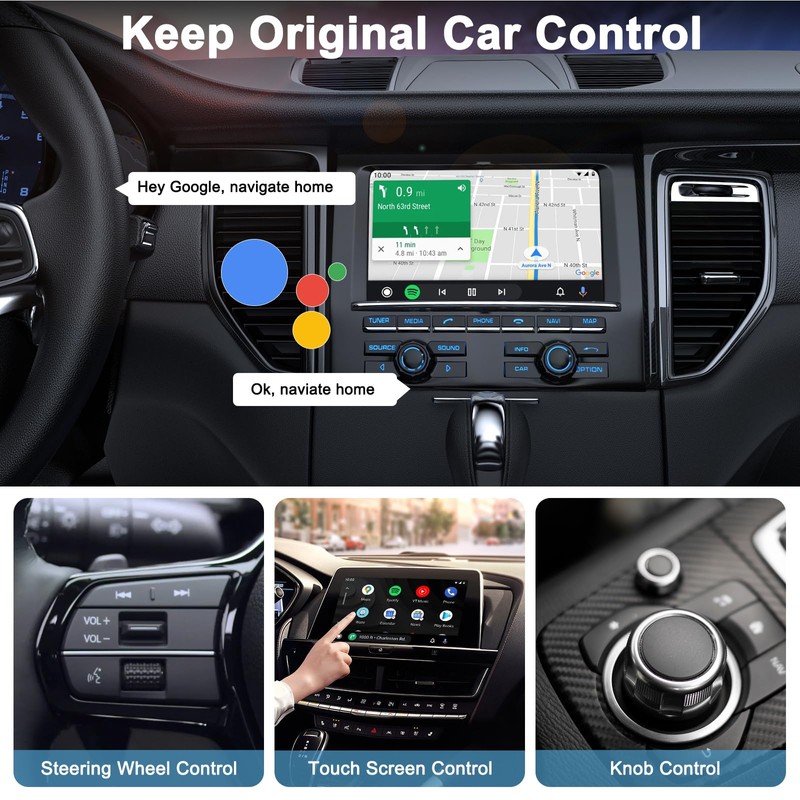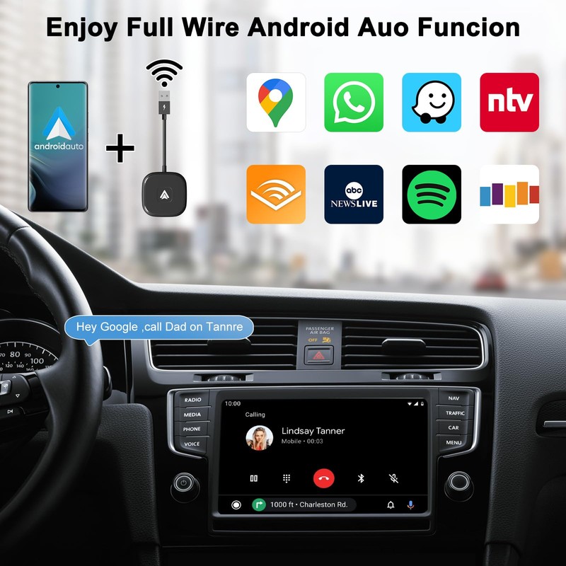 • [Intelligentes Fahren mit Android Auto Wireless] Die Wireless Android Auto-Unterstützung bietet eine Turn-by-Turn-Navigation, Echtzeit-Verkehrsinformationen und alternative Routen, die es Ihnen erleichtern, Ihre Ziele effizient zu erreichen. Adapter Android Auto ist mit beliebten Musik-Streaming-Diensten wie Spotify und Google Play Music integriert, so dass Sie Ihre Lieblingssongs über die Autolautsprecher abspielen können.