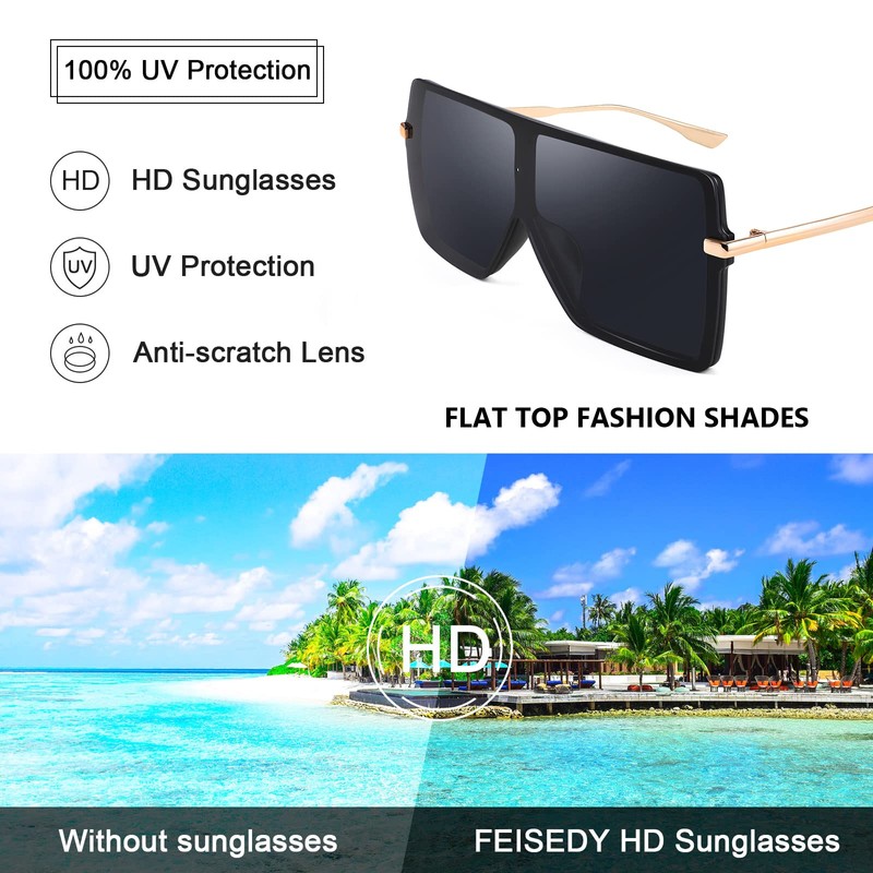 - FEISEDY Unique design: stylish frameless flat top oversized sunglasses, with sturdy metal hinges and metal temples, can extend the use of sunglasses and is a stylish match. Suitable for a wide range of face shapes.