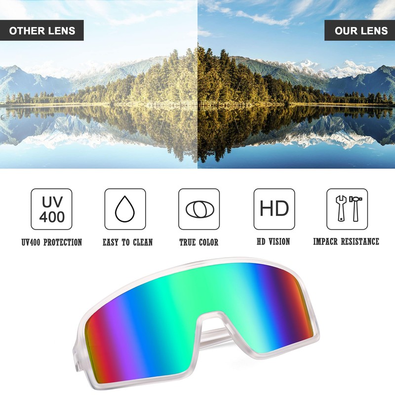- Adventure Spirit Design - These stylish sports sunglasses with oversized streamline frame show the spirit of exploration and adventure, suitable for men and women. Wraparound sunglasses can cover your eye and provide a wider field of view. High-saturation design bring you a timeless look, perfect for those who purse an active lifestyle.