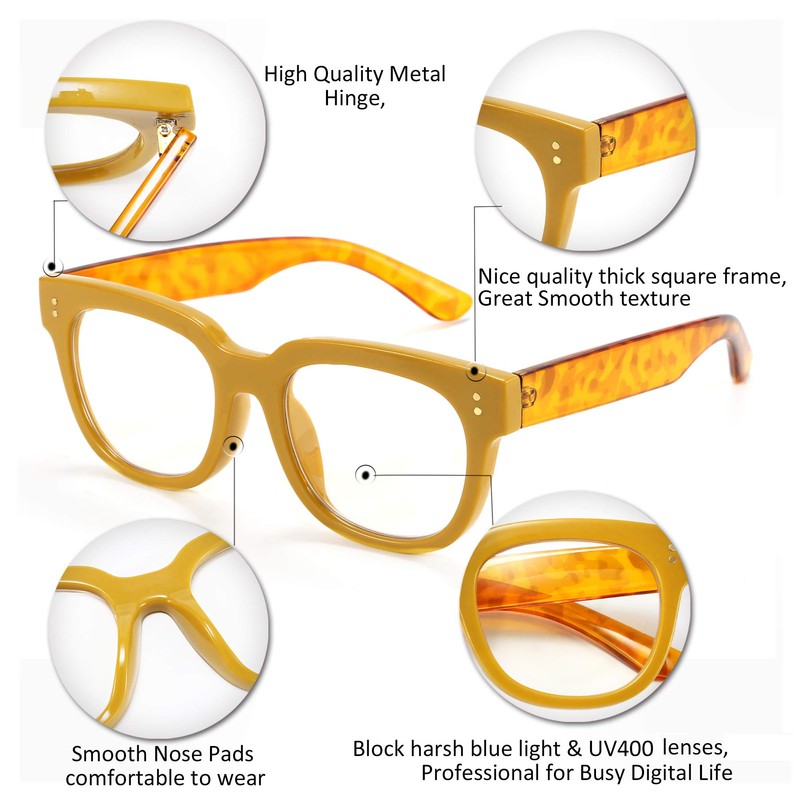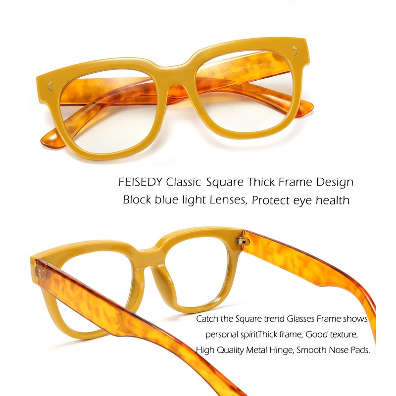 - FEISEDY CLASSIC SQUARE DESIGN – These retro square blue light blocking glasses with the full plastic thick frames Double Metal Studs Design bring you a timeless trendy appearance. These vintage glasses can go with various face shapes and hairstyles. You can wear FEISEDY Glasses for long periods in front of digital screens or your upcoming trip out of town.