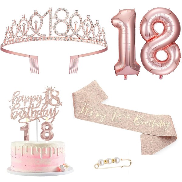 FEISHIONG 18th Birthday Party Decorations Set, Rose Gold Crown Tiara、Sash、Cake Topper、Number Balloons,18 Year Old Gifts for Female Friend、Daughter (Rose Gold Theme)