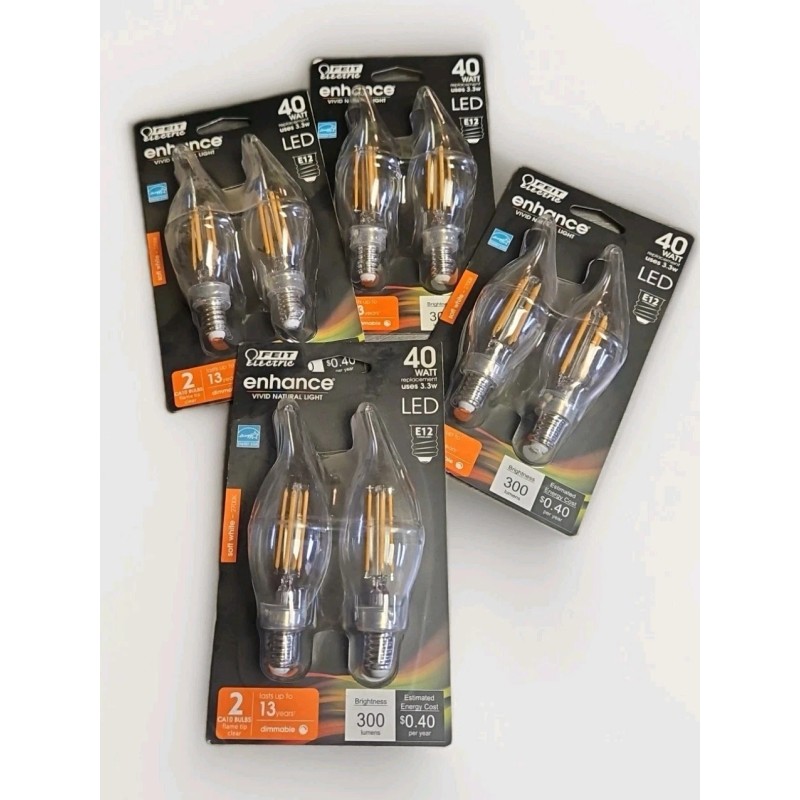 The LED 40W ENHANCE Vivid Natural CA-10 Flame Tip E12 4 2pk-8pc Dimmable Candelabra light bulbs by Feit Electric offer a soft white light color with a color temperature of 2700K. These energy-efficient bulbs are suitable for both indoor and outdoor use, with a lifespan of 15,000 hours. With a clear finish and flame tip design, these dimmable lamp bulbs provide a warm and cozy lighting ambiance while also being Energy Star certified for energy savings. Perfect for adding a touch of ambiance to any space, these LED bulbs are a reliable and long-lasting lighting solution.