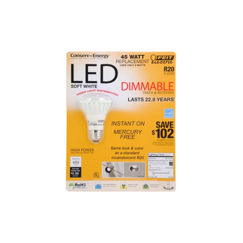 Feit Electric R20 Dimmable 45 Watt Replacement LED Soft White Flood. Uses 8 Watts
