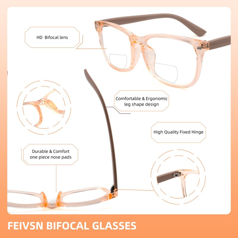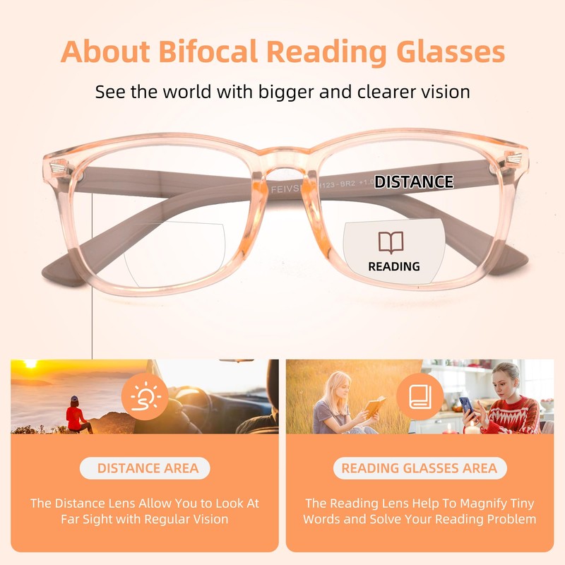 - Far and near Dual-use ReadingGlasses: FEIVSN bifocal presbyopic glasses that are excellent for all-day wear; No-magnification area is sufficient for distance watching TV / driving, while the reading area with precise magnification is perfect for reading / small print / writing / handmade and other close up activities