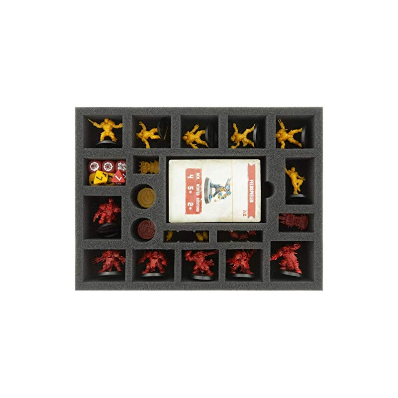 - A foam insert with 20 compartments for all miniatures, dice, (sleeved) cards, balls, coins and the score marker - a matching foam lid so nothing falls out.