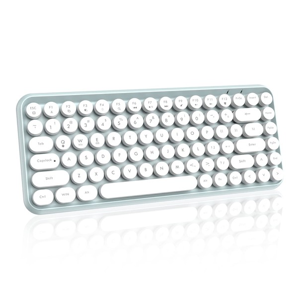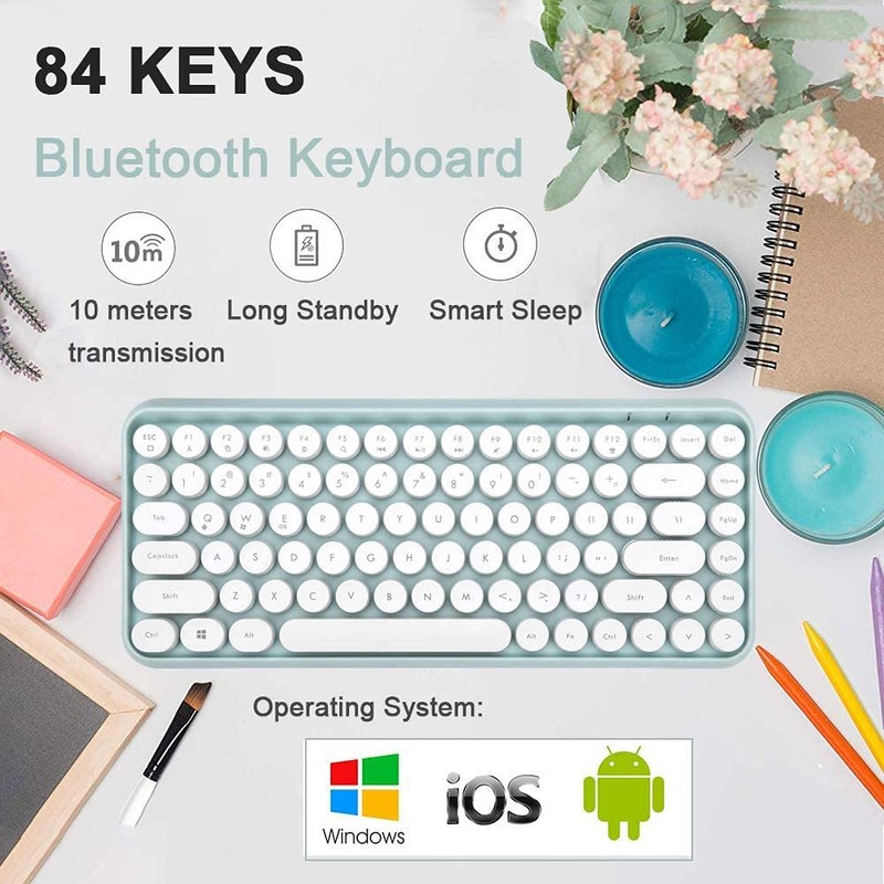 - ❤Compact & Fashion Bluetooth Keyboard: This Bluetooth keyboard has 84 round keys. It is compact and easy to carry. The fashion shape is inspired by the retro elegant typewriter shape, the unique round keycap. Just press FN + C keys to enter Bluetooth mode.