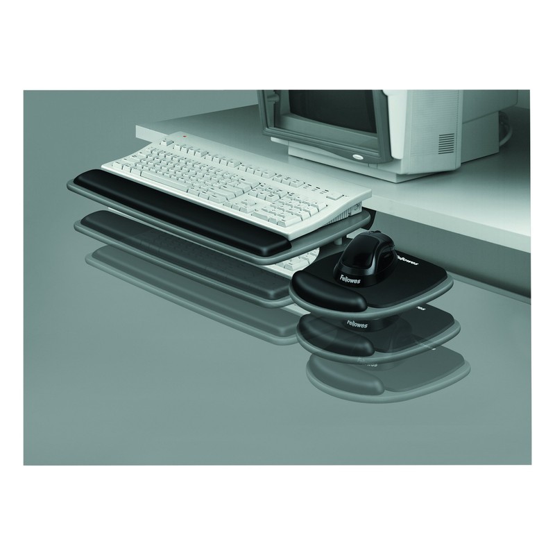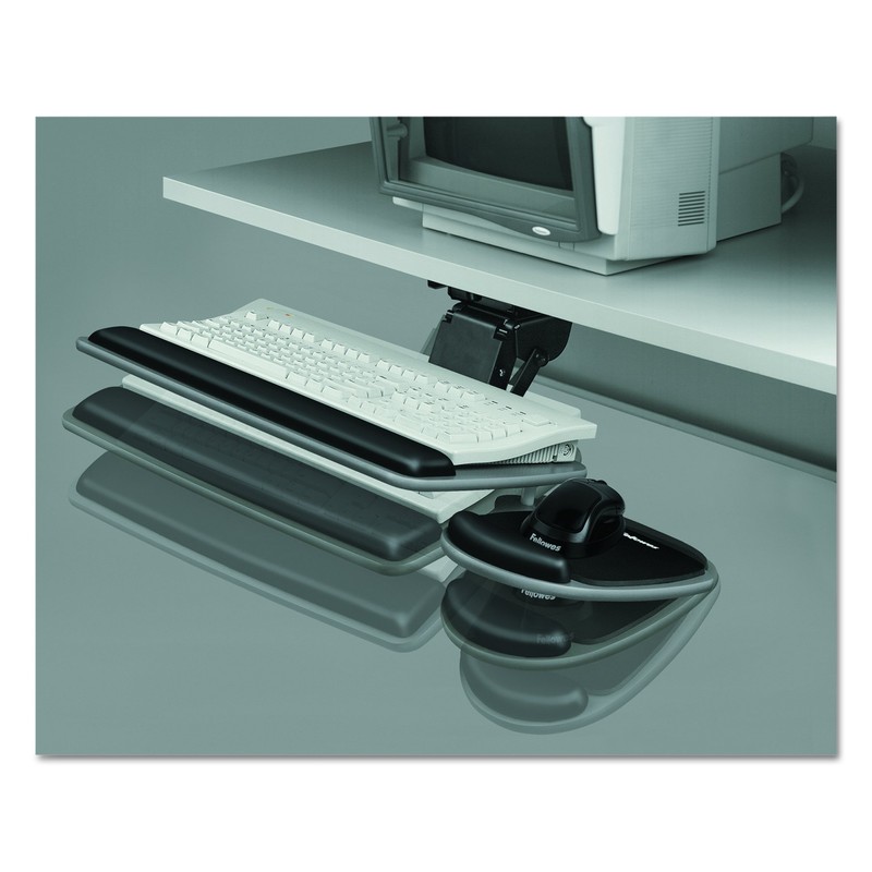 Enjoy custom comfort and easy space management with the fully adjustable Fellowes Keyboard Tray! Simply grasp and rotate keyboard tray to your preferred work position. Use a single knob to adjust the height and tilt for individual comfort. Both keyboard tray and mouse tray include soothing gel wrist supports. Mouse tray mounts to either right or left side or stows underneath for easy storage when not in use.