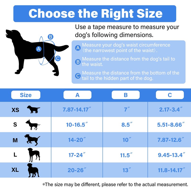 - Great Value Three-Pack:Available in 5 sizes, from XS to XL. Carefully measure your dog's waist and hind legs, choose the right size according to the size recommendation, six random combinations of colors, and each style is a great deal in a pack of three.