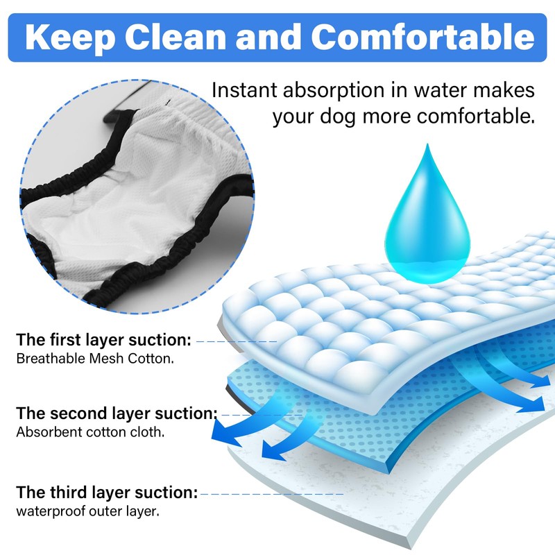 - Highly Absorbent & Leak-Proof Design:Breathable and comfortable with sewn super absorbent pads and quick-drying mesh fabric. The waterproof outer layer prevents leaks, controls odors, and ensures your dog stays dry and clean, preventing clutter and accidents.