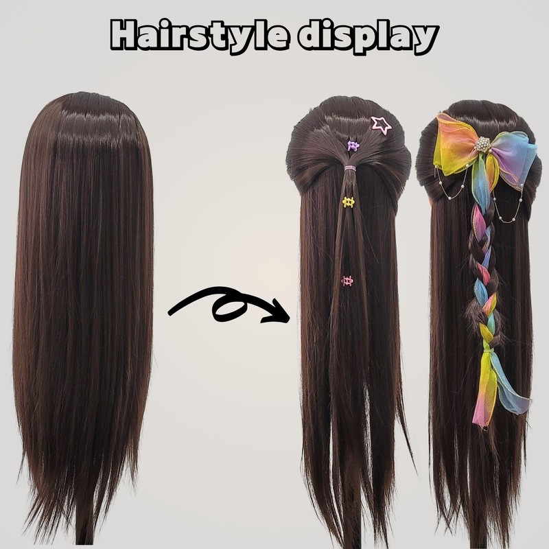 - Practice Hair Mannequin Head with High-quality and Soft synthetic Fiber Hair, 20inch Long (from the forehead to the back hair end), Black Brown Hair, Comes with gifts, Packaged in A Box