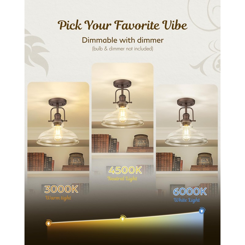 - 【Antique Style】The semi-flush ceiling light features a unique clear glass shade and vintage style oil rubbed bronze metal base, bringing a modern twist to its avant-garde retro design.