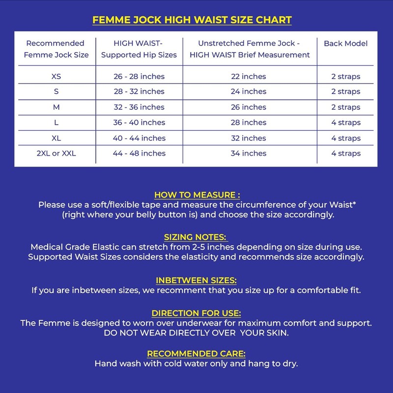 - HEALTH INSURANCE APPROVED: Femme Jock is your go-to for pelvic support, FSA and HSA-approved. Check our size chart for the perfect fit. Easy care – hand wash with cold water and hang dry for enduring support. Health-focused convenience made simple.
