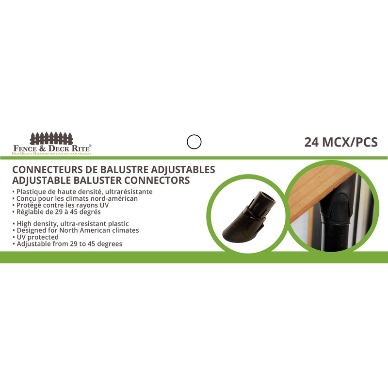 The Fence and Deck Rite adjustable baluster connectors are designed to fit the baluster to the top and bottom of your stair railing. Our adjustable baluster connectors have an adjustable range of 29-to-45-degree angle, which will ensure you hit the target angle of your stair. This will secure and support the integrity of your railing over time. As with all Fence and Deck Rite products, they are easily and quickly installed. We recommend using # 8 deck screws. (not included)