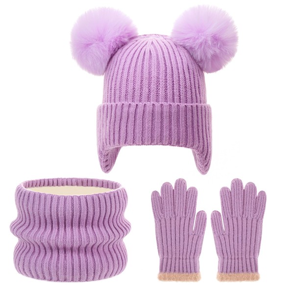 FENELY 3Pcs Kids Winter Beanie Hat Scarf Gloves Set, Children Knit Warm Ear Cap with 2 Pompoms+Fleece Lined Gloves+Neck Warmer for Boys Girls 3-10 Years