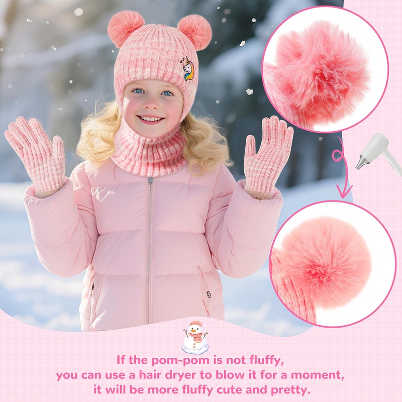 - 【Premium Warm Material】Made of premium knitted fabrics, our kid's winter set is skin-friendly, soft-durable and warm-keeping. The double pompoms beanie adds a touch of style to your child's outfit, while the scarf and gloves provide excellent protection against the cold. Perfect for indoor and outdoor activities.