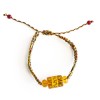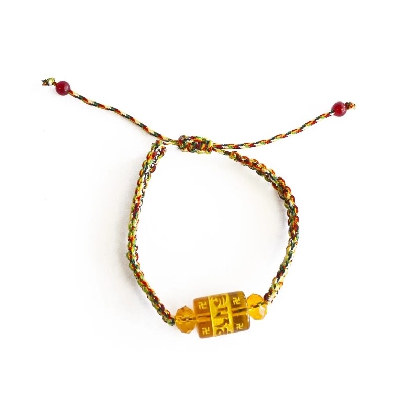 The string is made of 5 different colors of strings twisted together. 5 different colors of strings represent metal, water, wood, fire and earth in feng shui. Yellow Omani bead has Omani which can help wearer against harm and bring good fortune.
