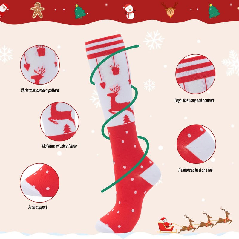 - KNEE HIGH SOCKS Bored with terribly samey socks? Don’t worry. We prepare a wide variety of cute compression socks for women. The colorful compression socks are carefully designed and the pattern design is very distinctive, The toe and heel portions are reinforced for added support and comfort. Just pick your favorite one from these fun compression socks to show your personality and style