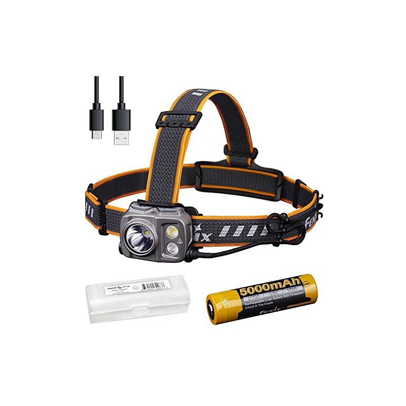 - Contents: Fenix HP25R V2.0 Headlamp, Fenix ARB-L21-5000 Li-ion Battery, USB Type-C Charging Cable, 4x Helmet Attachment Hooks, 3x Cable Clips, Spare O-Ring, LumenTac Battery Organizer