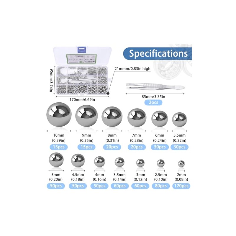 - Excellent AssortmentOur stainless steel ball bearings comes with 13 sizes: 120pcs 2mm, 80pcs 2.5mm, 60pcs 3mm, 60pcs 3.5mm, 50pcs 4mm, 50pcs 4.5mm, 50pcs 5mm, 30pcs 5.5mm, 30pcs 6mm, 20pcs 7mm, 20pcs 8mm, 15pcs 9mm, 15pcs 10mm. Each size is stored separately for reach.