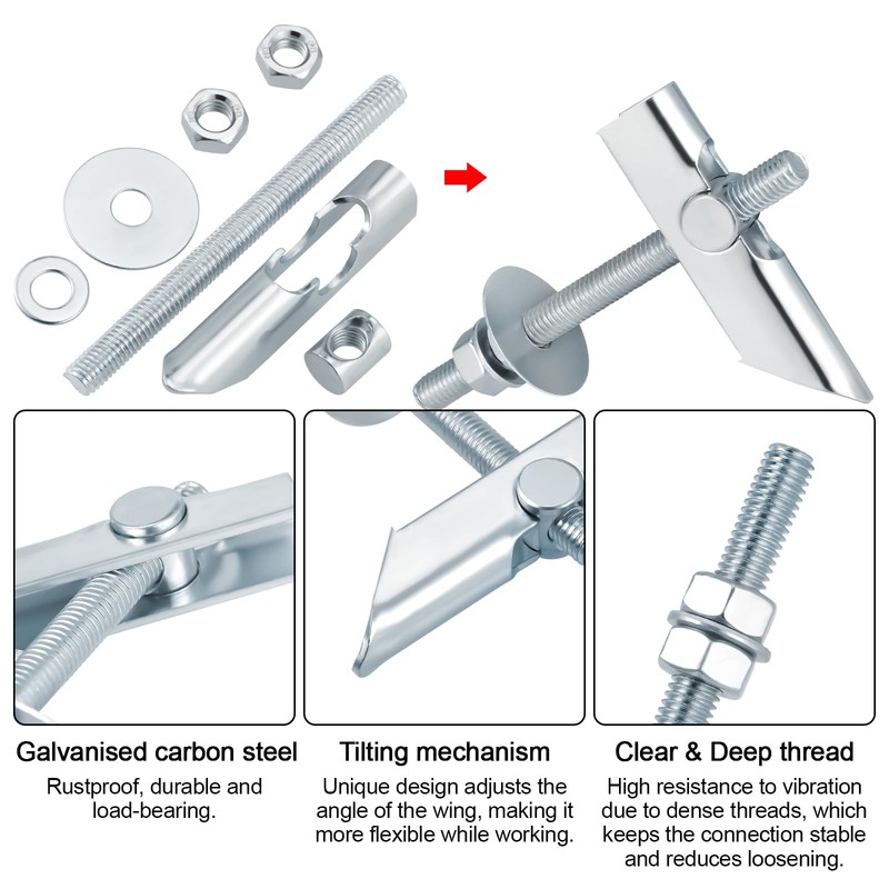 - Easy installation: First drill a hole in the wall, then assemble the nut, screw and washer, screw and tilt the wing so that the wing and nut are in the same line, insert them together into the wall hole and tighten the screw as needed.