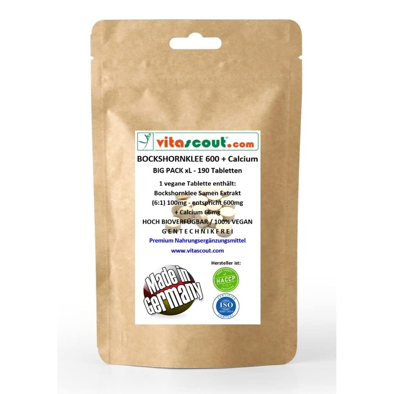 Fenugreek Extract 600 Activated + Calcium - 190 Vegan Tablets (Extract 100mg 6:1) Equivalent to 600mg Powder Per Tablet + Calcium 66mg - Made in Germany