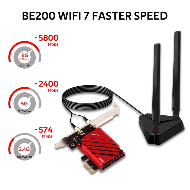 • FENVi WiFi 7 pcie wifi card Support Tri-Band(2.4GHz, 5GHz, 6GHz) Transmission, 6GHz maximum data rate of almost 5.8 Gbps, which is 2.4X faster than the 2.4 Gbps possible with Wi-Fi 6/6E and could easily enable high quality 8K video streaming, 5Ghz data rates up to 2400Mbps, 2.4GHz date rates up to 574Mbps. FENVi WiFi 7 pcie wifi card Support Windows 11/10 for Desktop PC. You could download the driver from i-n-t-e-l Website(https://www.intel.com/content/www/us/en/products/sku/230078/intel-wifi-7-be200/downloads.html) or our FENVi official website( www.fenvi.com).